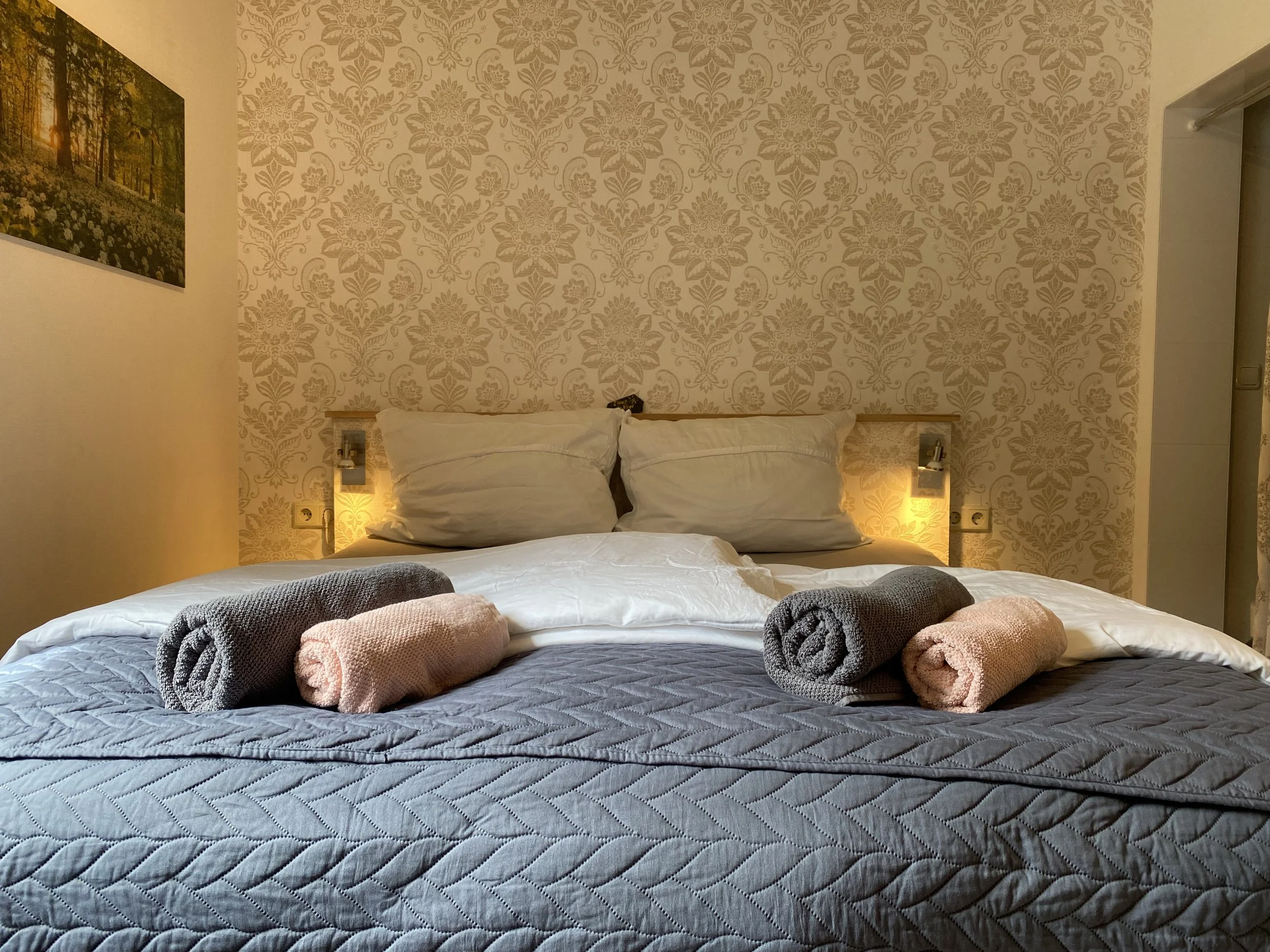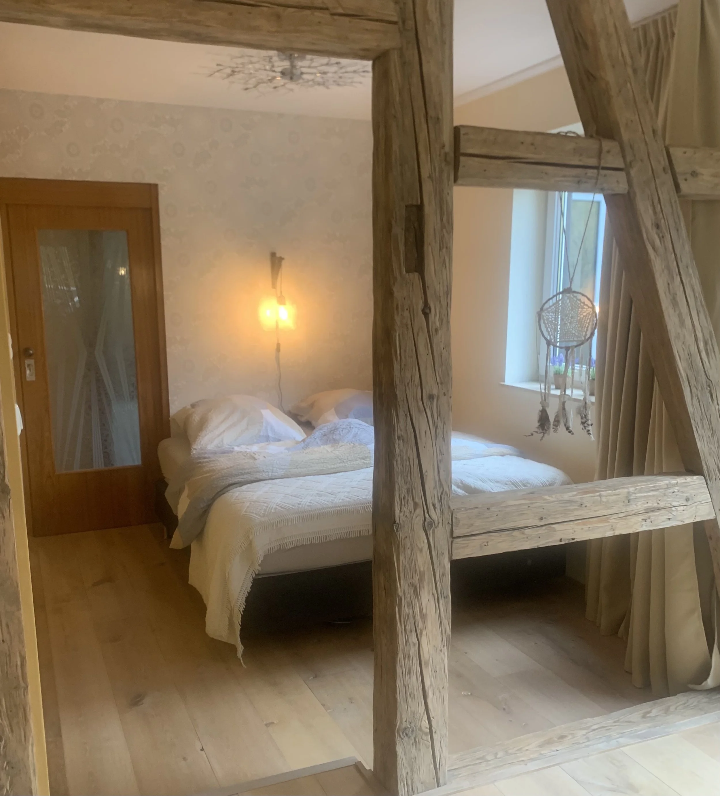 Entspannen Sie in unserem größten Zimmer und genießen Sie die Ruhe während Ihres Aufenthalts. Die private Sitzecke und das Badezimmer bieten Ihnen jeglichen Komfort. Vom ersten Stock aus haben Sie einen wunderschönen Blick auf die Wiese und die Wälder hinter unserem Pension.